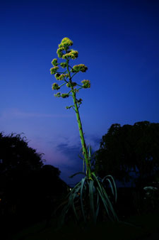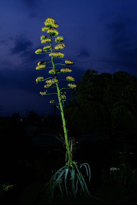 神奈川県の相模原に 咲いた竜舌蘭は 高さ約8メートル 日が沈むのを待ち 大型ストロボで撮影 |